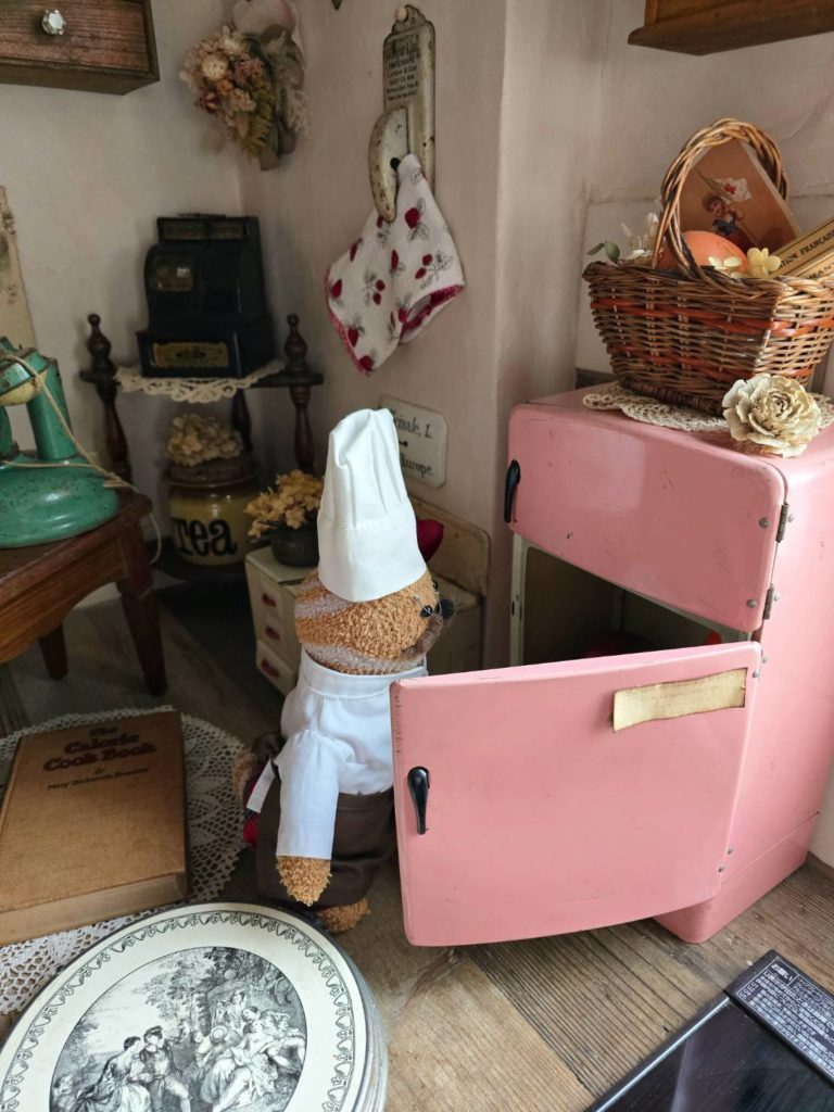 冷蔵庫はもとより、トーションをつまんでいるピンチ、ブレンダーの古ぼけ具合、レジスターまで!!!これ一つづつ集められたのかしら???